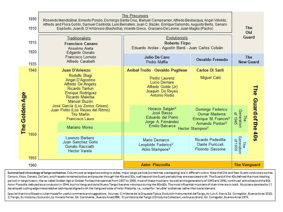 Tango, the most relevant cultural phenomenon of the Argentinean society, had its golden époque during the so-called “the Decade of the Forties”. During this period, which actually expanded from the late 1930s to the mid-1950s, thousands of musicians in hundreds of orchestras embraced tango music, and millions of Argentineans poured onto the dance floors. Musicians such as Juan D’Arienzo, Carlos Di Sarli, Anibal Troilo, and Osvaldo Pugliese were celebrities of the highest imaginable popularity. Just the announcement of any of these names was enough to fill out the biggest music halls; their soundtracks beat records of diffusion.